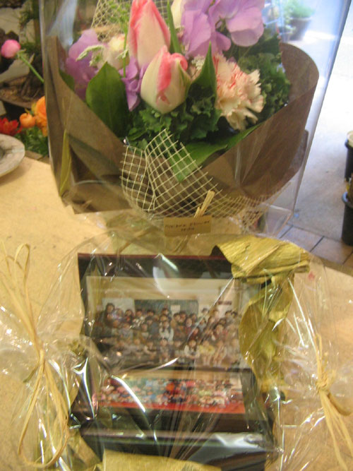 これは1年間お世話になった先生にクラスの子供たちからの写真と寄せ書きと花束です。
