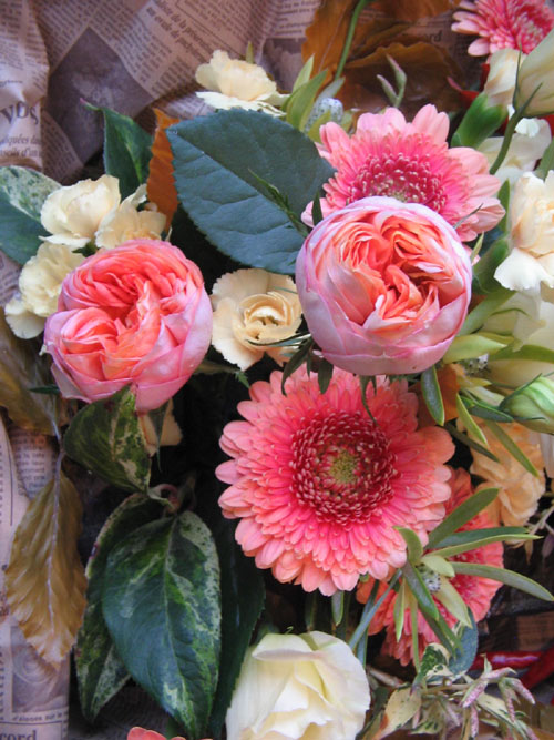 ベビーロマンチカってバラを使ったアレンジとストロベリーチョコレートコスモスを使ったアレンジメントを納品。