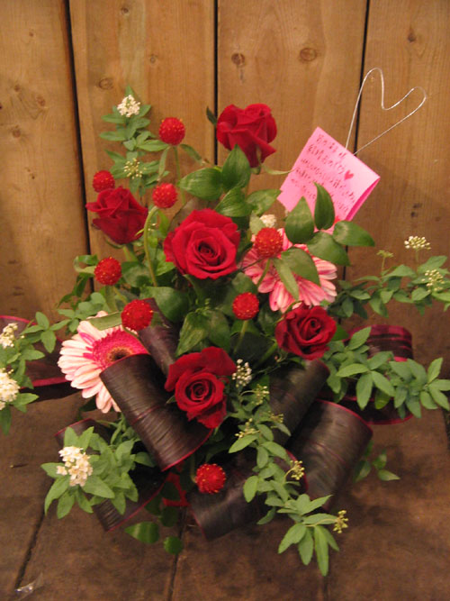 入籍した女性のテーマカラーが赤ということで赤いローズと千日紅をいれました。