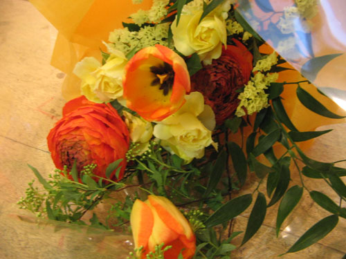 spバラと八重咲きのチューリップを使った春らしい花束。