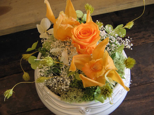 バラ、胡蝶蘭、あじさいなどのプリザーブドフラワーをつかったアレンジです。