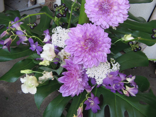うす紫のポンポンダリアと深い紫のデンファレのコラボがなんとも涼しい感じ。