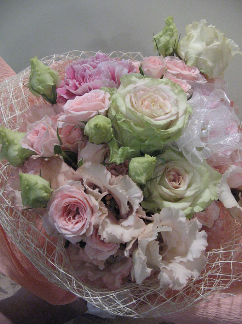 フリフリの花びらが豪華で可愛いトルコキキョウや、バラなどのお花を使った花束でした♪
