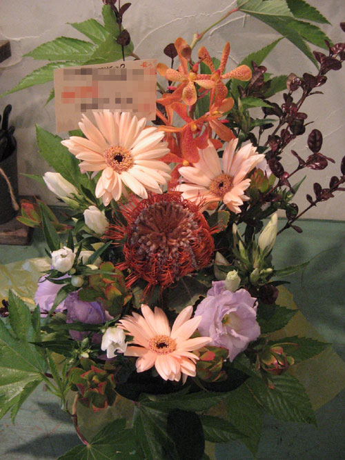真ん中にバンクシア、ガーベラ、トルコキキョウ、リンドウ、リューカ、ラン‥