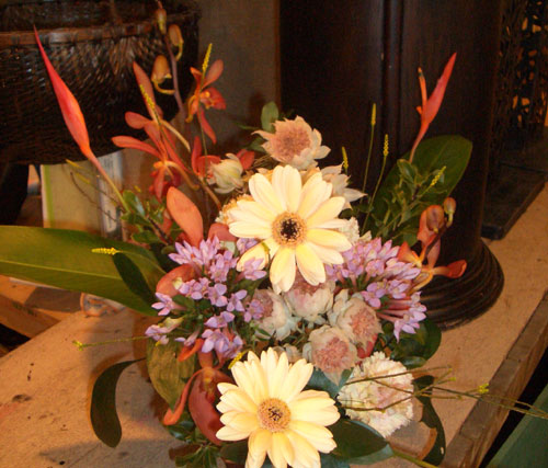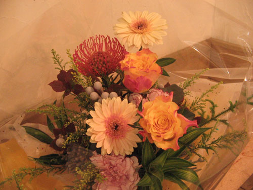 セルリアやガーベラなど、明るくて優しい色あいのお花でアレンジ。