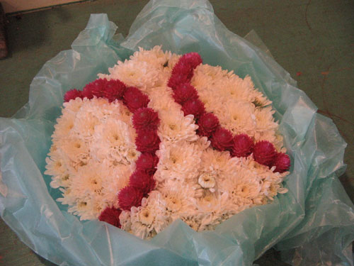 仏様のお供え花のアレンジメントだったので、ボールの白い部分を菊で、線の部分を千日紅を使ってつくりました***
