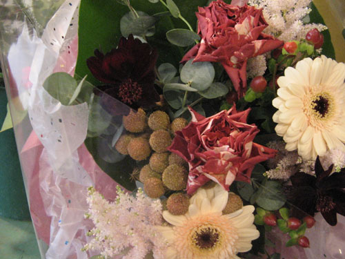 くしゅくしゅっ とした花びらがとっても可愛い赤と白のバラをメインに、チョコレートコスモス・ヒペリカム・クリーム色のガーベラ・まん丸の実のようなバーゼリア‥☆