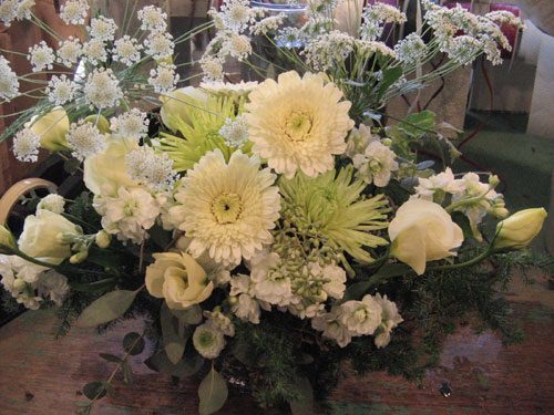 白の八重咲きガーベラやグリーンがきれいなアナスタシアなどを使いました。