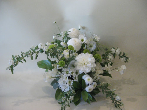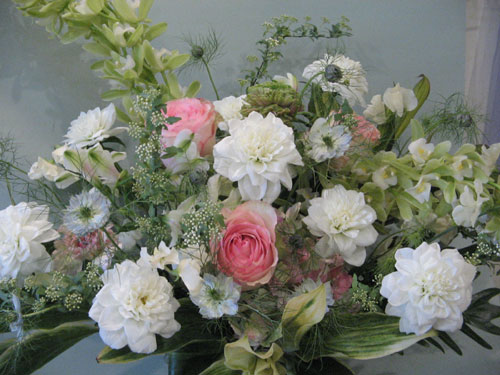 白のダリアとグリーンのシンビジュームがとてもきれいで・・