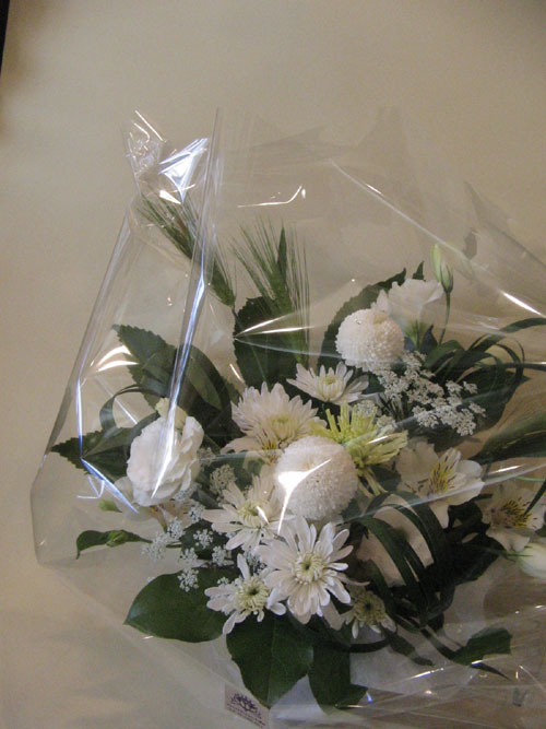ピンポンマム・トルコキキョウ・アルストロメリア・レースフラワー‥ 白とグリーンの素敵な仏花になりました。