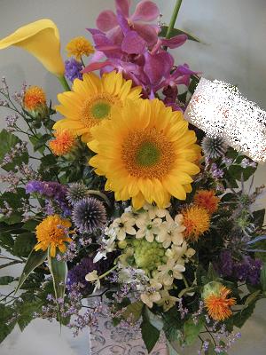 レモン色とオレンジ色のヒマワリを使ってのアレンジメントでした☆