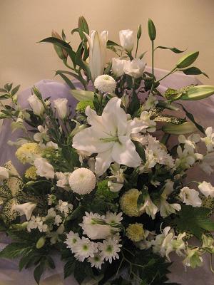 白のユリをメインにして、ピンポンマム・スプレーマム・トルコキキョウ・デンファレ・クリーム色のマリーゴールド などなど