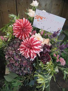 キングプロテア、紅白ダリアでとってもおめでたいスタンド花になりました☆