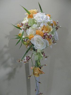 オレンジ色と白色のバラ*サンダーソニア*デンファレ*フランネルフラワー*オンシジューム**