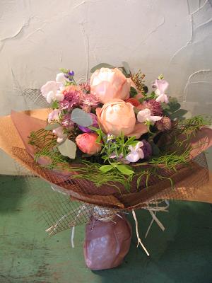 ピンクのシンビジュームにピンクのライスフラワー、チョコレートコスモスなど‥