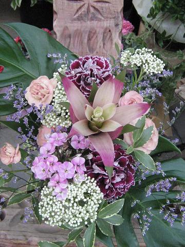 お家にある何気ない器・ジャムのあきびん・やかん・湯のみetc・・・なんでも花器になっちゃいます。ちょっとした工夫で自分らしくステキにしちゃいましょ。お店にいてお花を販売しているとき,よく『うちの花瓶は大きいからたくさんお花がいるの』なんて聞きますが,少ない花材でもいけるんです。葉物・枝物がポイントなんです。お花の種類によってもあつかい方がちがいます。ガーベラはもたないから嫌い・・・そんなことはないの。お水を少なめにいけてみて!10日は余裕で飾れます。そんな感じに,お花に関する色んなお話をしていこうと思っています。