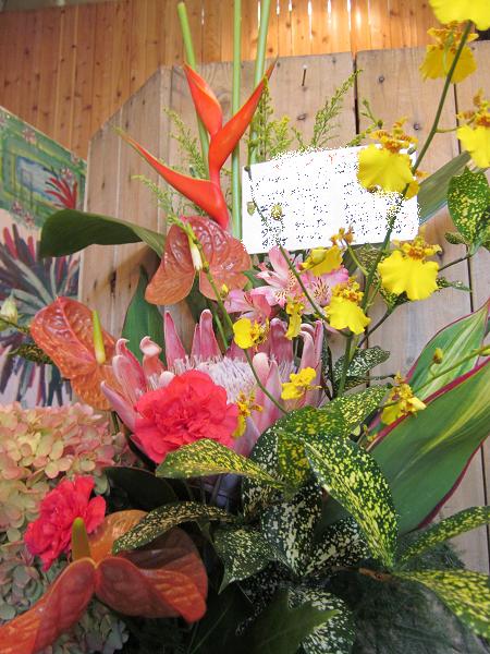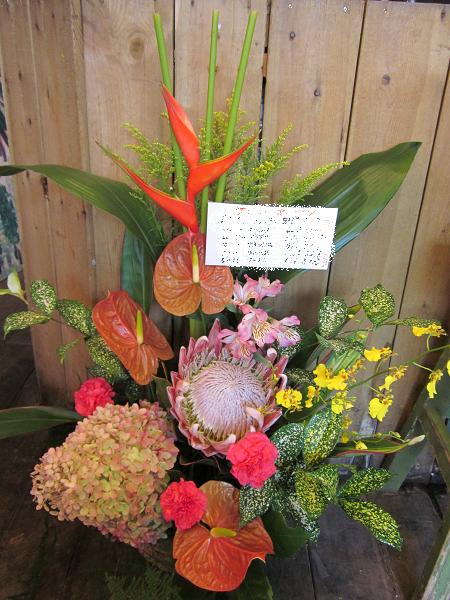 キングプロテアにヘルコニア、アンスリウムなど熱帯のお花たちを使ったアレンジメントです。