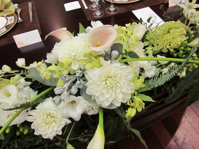 真っ白なダリアに、カラー、白をメインにグリーンでまとめました。