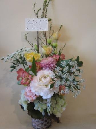 白のおっきなラナンキュラスを中心に、周りをパステルカラーで覆った、春色のお供え用アレンジメントです♪