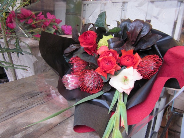 真っ赤なラナンキュラス、ピンクッション、プロテアアイビー、グラジオラス などなど…