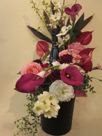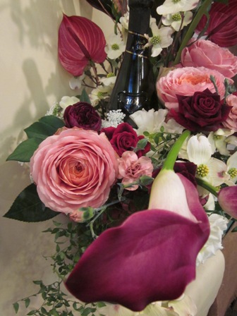 ワイン色のカラーに、アンスリウム、赤バラ、トルコキキョウ、花水木などなど。