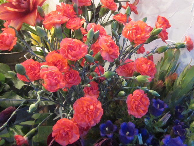 ワイン色のカラーに、アンスリウム、赤バラ、トルコキキョウ、花水木などなど。