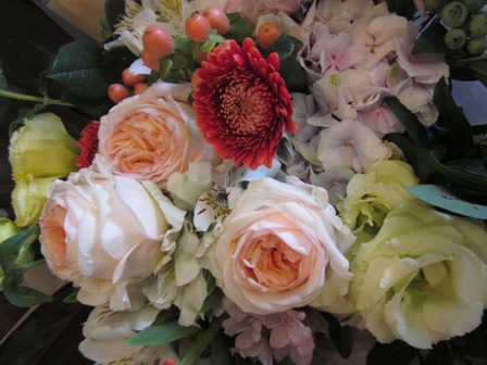 中が淡いピンク色のバラと、りんごみたいなminiガーベラを合わせて。トルコキキョウや秋色アジサイ、白いアルストロメリアにデルフィニウム、ヒペリカムとブルーベリーなど‥!