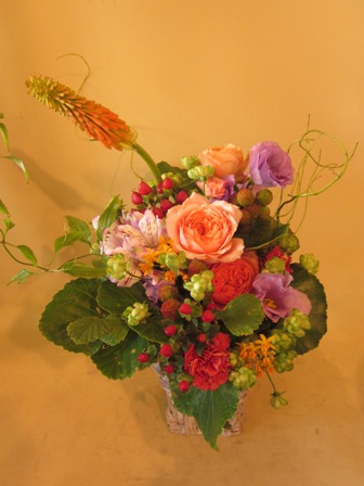 本日のアレンジメントは***ちょっとトロピカル☆サーモンピンク色の優しいバラに真っ赤なヒペリカム‥。ぴょんと飛び出した夏の不思議なお花はトリトマです!ユリ科で、下向きに花を咲かせています。花言葉は{あなたは私を楽しませる}でした^^