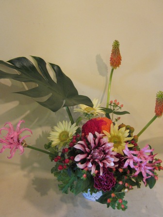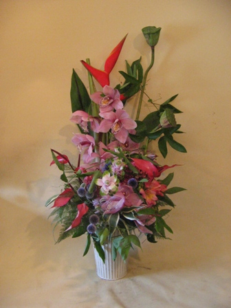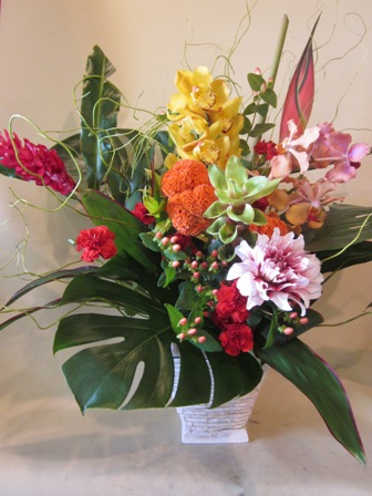 シンビジューム、アンスリウム、クルクマ、ヘルコニア!力強いアレンジメントです。