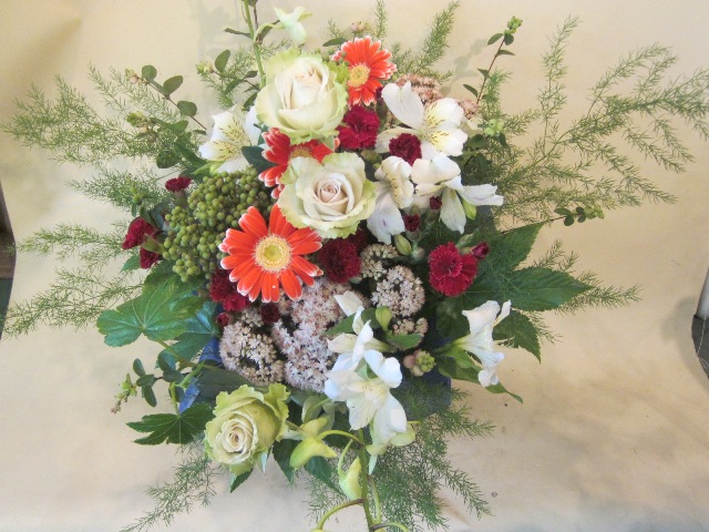 白と緑系を基調としつつもアクセントとしてオレンジのガーベラと赤のカーネーションが入っていて凄くキュートです☆!