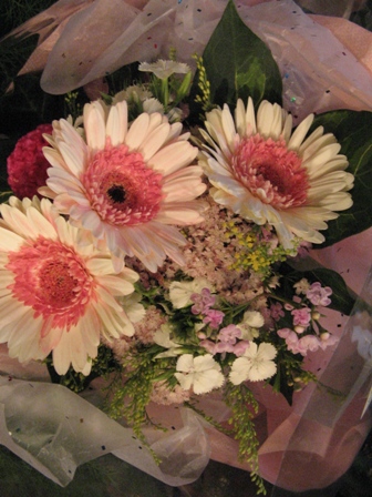 ピンクのガーベラに白のナデシコ。八重のワックスフラワー。