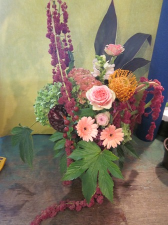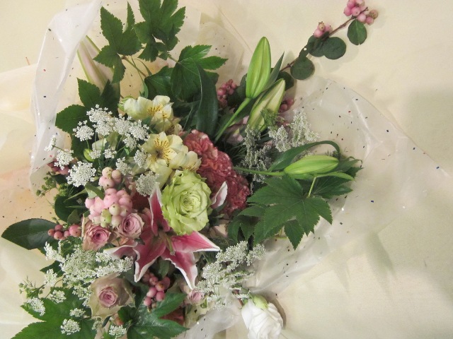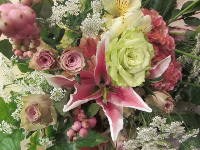 グリーンとピンク色のバラをメインに、シンフォリカルポスというピンクの実やホワイトレースフラワーを入れて清楚で可愛らしく。ゆりやアルストロメリアで華やかに^^