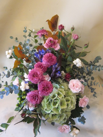 すっごくモコモコ咲く、ワイン色のスプレー薔薇を使いました。