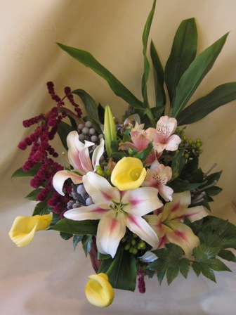 グリーンのヒペリカム、アルストロメリア、ケイトウのアマランサス、カラーなど‥☆