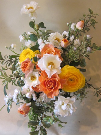 オレンジのバラと白の形の違ったバラをコラボして、ラナンキュラスで可愛らしさを出してみました***