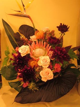 キングプロテアを使って、シックな色のダリアをつかいました。