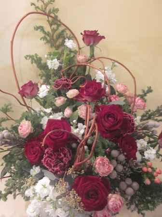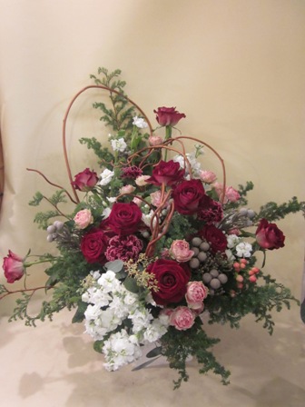 赤白緑。葉っぱにはヒムロ杉、中が深い赤色になっていくバラとピンクのスプレーバラ、白いお花は爽やかな香りのストックにして。