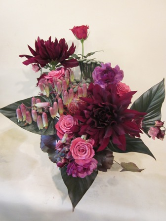 白ガーベラと白ダリア、クリーム色のスプレーバラ赤紫のアジサイなど‥☆