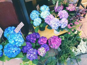 ピンク、青、紫などなどいろいろなアジサイございますよ。