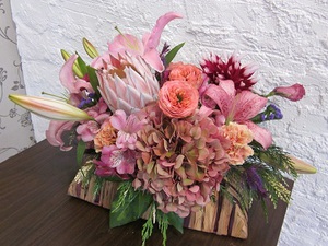 ピンクのお花がたっぷり使われたアレンジメントです。