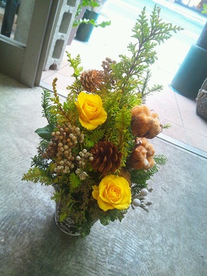 松ぼっくりやコットンフラワー、そしてバラをアレンジした
